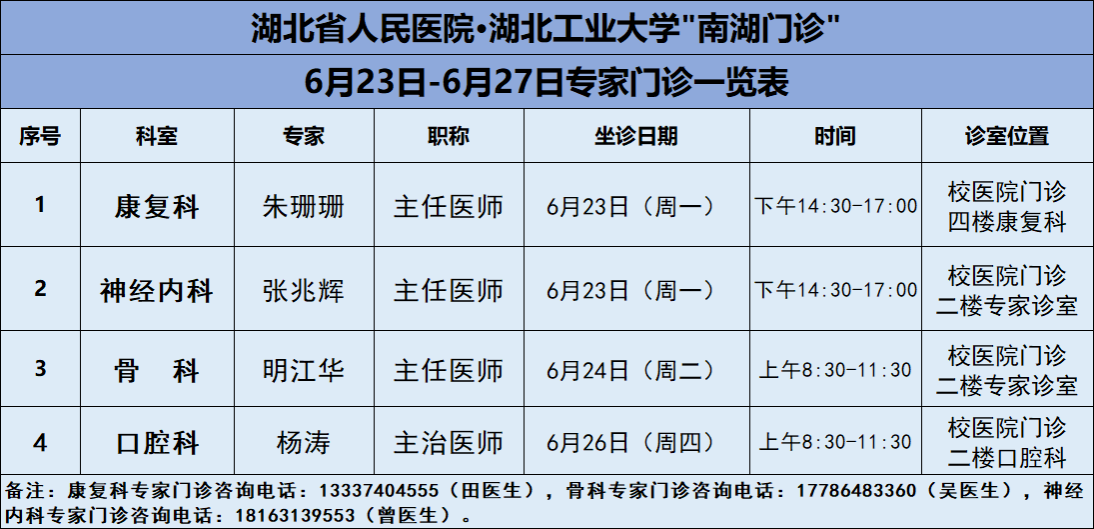 6月23日-6月27日,beat365英国官方网站医院将邀请湖北省人民医院知名专家——康复科朱珊珊主任、神经内科张兆辉主任、骨科明江华主任、口腔科杨涛医生四位专家教授前来校医院坐诊(具体坐诊信息见下),请广大师生、周边居民持续关注南湖门诊专家坐诊信息,如有: